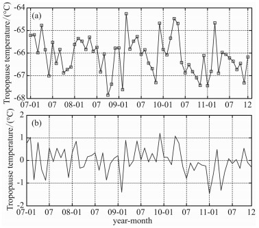 图 9 2007年1月至2011年12月中国区域对流层顶温度月平均变化 (a)表示对流层顶温度的月平均变化,(b)表示去除季节性变化的对流层顶温度月平均距平变化. Fig. 9 The tropopause temperature monthly means (a) and its de-seasonal monthly anomalies (b) during the period between Jan 2007 and Dec 2011 over China |