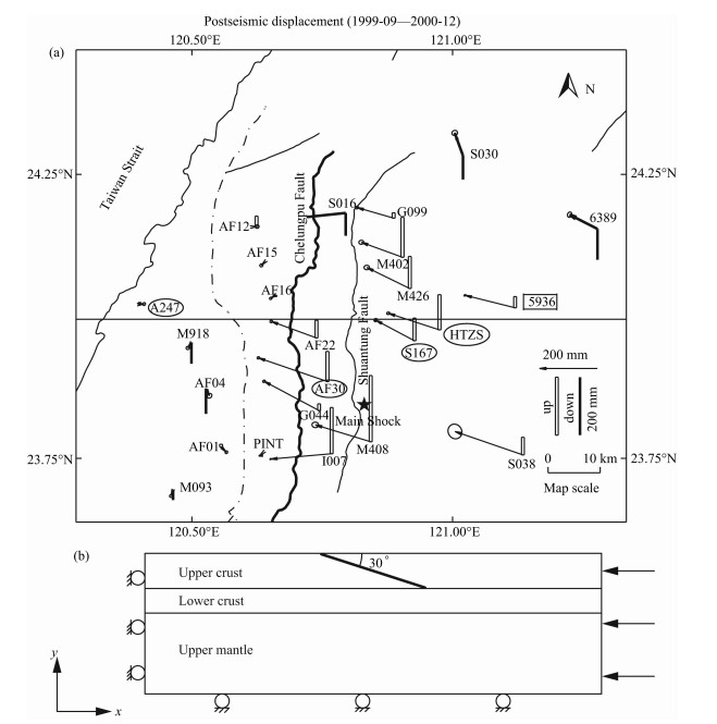 部分反演研究结果显示车笼埔断层下方存在近水平的滑脱面[2, 31], 且它在集集地震后产生了滑动.然而, 采用本文的数值方法, 通过大量数值计算试验, 结果显示水平滑脱面的震后滑动对地表变形的影响很小, 可以忽略.因而考虑到对结果影响不大, 为简单起见, 本文将断层简化为图 1b所示的模型.本文通过动力学模拟的最新研究, 获得了1999年台湾集集地震震后变形机制的新认识, 尽管基于本文采用的数值方法计算得到的结果支持黏性松弛机制, 不支持单独的震后滑动机制, 但对该问题的最终定论还需进一步的研究.