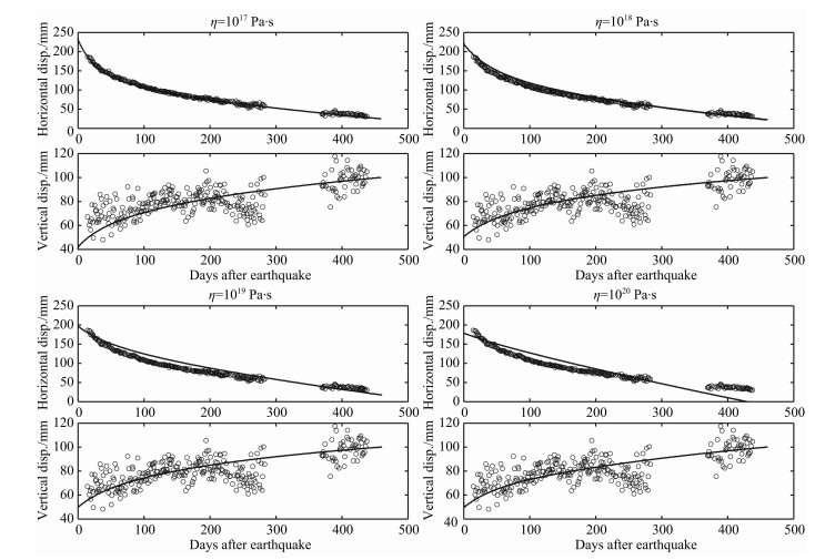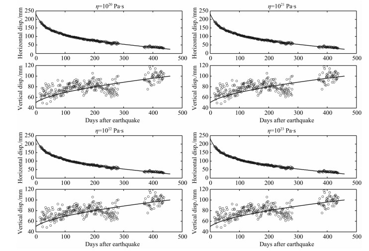 4 数值模拟结果 4.1 黏弹性模型结果首先根据GPS观测资料采用试错法确定下地壳和上地幔的黏度.以剖面附近的台站5936为例(见图 1a中的矩形框).取上地幔黏度为1020Pa·s, 图 2显示了下地壳黏度分别为1017、1018、1019、1020Pa·s的地表台站5936处的位移数值解和观测数据的比较, 结果显示当下地壳黏度为1017 Pa·s时, 计算结果与观测数据吻合得最好.其中, 黏度1018Pa·s的结果与观测吻合也较好, 但相比1017 Pa·s要略微差一些.1019Pa·s和1020Pa·s的计算结果则显示出这两个下地壳黏度值的不合适.然后选取下地壳黏度为1017Pa·s, 图 3显示了上地幔黏度分别为1020, 1021、1022、1023 Pa·s的计算结果与观测的比较曲线, 由图可见, 上地幔的黏度值选取不同对结果的影响很小, 这是由于一方面上地幔层在深度上相对于下地壳而言距离断层和地表较远, 因而对地表位移的影响较下地壳要小; 另一方面, 上地幔的松弛时间相对下地壳要长, 450天对上地幔而言是一个较小的时间尺度, 因此该阶段的地表位移对上地幔黏度值的改变不如下地壳敏感.因此, 根据GPS观测数据只能确定最合适的下地壳黏度为1017Pa·s, 无法确定上地幔黏度, 为方便起见, 在此后的计算中统一取上地幔黏度为1020Pa·s, 下地壳黏度为1017Pa·s.