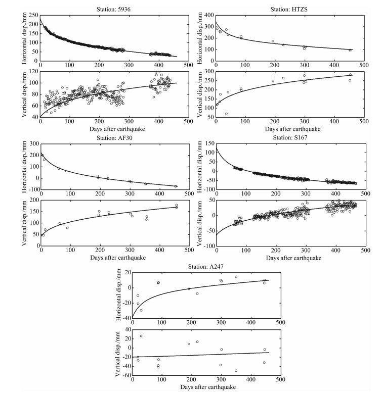 利用确定的下地壳和上地幔黏度, 可以计算震后450天内整个模型区域(包括断层面上)的位移场和应力场.由于数据有限, 本文选取剖面附近的五个台站进行比较(见图 1a中的椭圆和矩形框所示).上盘的四个台站分别是5936, HTZS, AF30和S167, 下盘的一个台站是A247.图 4显示了上盘和下盘台站处计算得到的震后位移与GPS观测数据[2]的比较.由图可见, 计算结果与观测值吻合得非常好.这表明了模型及参数选取的合理性, 较好地反映了震后变形的主要特征.