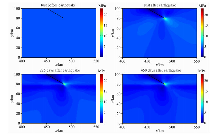 数值计算还得到了断层面及附近区域的剪应力分布及其演化, 图 5显示了断层附近150 km宽的区域内沿断层面方向剪应力在震前和震后不同时刻的空间分布图.震前区域内的应力场是均匀的, 但断层面上的剪应力大小并不均匀, 因为有初始场的存在.地震刚结束时, 断层上出现了明显的剪切应力降, 且沿断层两侧是近乎对称分布的, 但断层尖端有应力集中.数据结果显示断层面上的剪切应力降分布并不均匀, 平均值大小约为4 MPa, 这与Zhang等[27]根据震源动力学研究得到的应力降平均值约为5 MPa的结果非常接近.地震之后225天时, 断层附近区域内部的应力开始慢慢调整, 由于下地壳黏度较低, 该层的应力逐渐松弛, 应力值相对地震刚结束时明显要小, 之后的更长时间里(450天), 区域内的剪应力改变很小, 但断层面上的剪应力又逐渐积累, 开始孕育下一个新的地震事件.