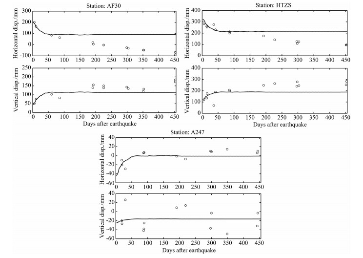 图 6 三个台站处(AF30、HTZS和A247)计算得到的震后位移曲线与GPS记录[2]的比较 图中实线代表数值计算结果,圆圈代表GPS数据.横纵坐标含义同图 2.计算结果与观测数据只在震后几十天内吻合,约50天后地表位移基本不随时间变化,但观测数据显示直到震后450天地表位移仍在增加. Fig. 6 Comparisons of computed postseismic displacements at three stations (AF30, HTZS and A247) with GPS data[2] Solid lines are the numerical results, and circles stand for GPS data. Horizontal and vertical coordinates are the same as those in Fig. 2. Computed results are consistent with recorded data only in tens of days, and the displacement on the ground almost remains unchanged after 50 days after the earthquake. However, observed data indicate that the displacement on the ground increases even 450 days after the earthquake. |