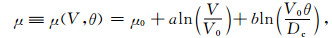 为了单独探讨黏性松弛和震后滑动两种机制对震后变形的影响, 模拟黏性松弛机制时, 下地壳和上地幔的黏度由GPS观测数据约束来得到; 模拟震后滑动机制时, 整个岩石圈均采用弹性材料, 并利用速率状态摩擦定律来描述震后滑动机制[10, 13], 即地震之后断层面上的摩擦系数满足Dieterich-Ruina定律[13, 25-26]:
