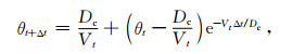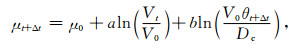 其中, μ0是以某一参考速度V0作稳定滑动时的摩擦系数, V为滑动速度, Dc为临界滑动位移, θ为状态参量[26], a和b为与材料性质有关的摩擦参数.将(3)、(4)两式对时间做离散化t+Δt寸刻的状态参数θt+Δt和摩擦系数可用t时刻的参量表示如下: