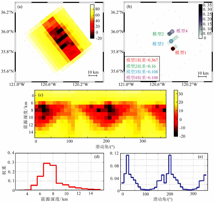 图 4 Parkfield地震震源参数估计结果 (a)震中格点搜索AICc值分布图;(b)震中模型选择结果,圆圈表示选中的4个模型震中位置;(c)以模型1为震中估计震源深度和滑动角的AICc值分布图;(d)震源深度的权重值分布;(e)滑动角的权重值分布. Fig. 4 Source parameters estimation result of the Parkfield earthquake (a) AICc distribution of epicenter search grids; (b) Epicenter model selection results with 4 circles; (c) AICcdistribution with different focal depths and rake angles for the epicenter Model 1;(d) and (e) are weight distributions with focal depth and rake angle, respectively. |