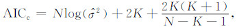 其中ISi和IBi分别为第i个点的模拟计算烈度值和烈度记录值,N为烈度数据点总数.接着采用适用于小样本情况的赤池信息准则[13-14]来计算每个设定震源模型的AICc值,即各震源模型与烈度记录间的相对熵