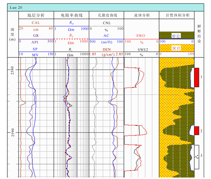 图 8是Luo20井的实际测井曲线,在2号解释层中,上半部分电阻率高,约为20Ωm,而下半部分电阻率降低,只有10Ωm.在岩性和孔隙结构背景基本一致情况下,这种电阻率的变化完全可以归结为油珠形态和孔隙结构之间组合方式的变化.另一方面,在具有复杂孔隙结构的储层中,油气在孔隙中的不均匀充填可能导致高含油饱和度的储层显示为低电阻率(图 7),也就是所谓的低电阻率油层[16],所以,本次研究的数值模拟结果证实,复杂孔隙结构是低电阻率油层的成因之一.