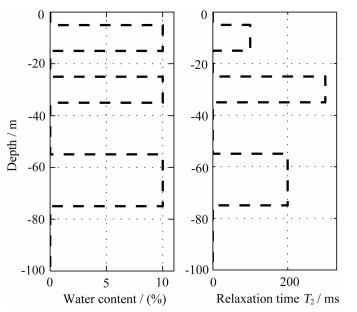 (4)假设地下存在三个含水层(图 6),第一层设置于地下浅层5m至15m,含水量为10%,弛豫时间T2为100ms;第二层设置于地下中层25m到35m,含水量为10%,弛豫时间T2为300 ms;第三层设置于地下深层55m到75m,含水量为10%,弛豫时间T2为200ms;