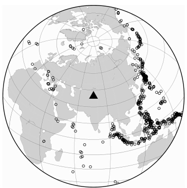 ![]() | 图 2 提取接收函数的地震震中分布圆圈为接收函数用到的地震位置,三角形为研究区的中心位置. Fig. 2 Distribution of teleseismic events used in our studyThe circles are the teleseismic earthquakes,the triangle shows the central position of study region. |