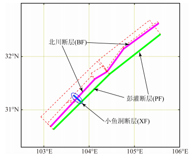 汶川地震破裂反演结果显示破裂在30 s内初始阶段过程比较复杂,在破裂前锋到达小鱼洞断层附近时,可能发生了重要的转换.比如王卫民等(2008)的反演结果显示汶川地震破裂前锋在小鱼洞 断层附近出现了2~4 s的“停滞”,越过该区后,破裂加速向北东方向扩展;Shao等(2010)以及Hartzell 等(2013)的模拟表明,破裂在彭灌断层上向北东和向浅部扩展约20 s后,另一支破裂才出现在北川断层上,且首先出现在震中北东42 km的近地表部位,然后该支破裂向北东和南西双向扩展.这样的破裂顺序细节与目前关于汶川地震破裂的主流观点不同.此外,北川断层上初始破裂出现的部位大致对应着与小鱼洞断层相交的位置,指示出小鱼洞断层在两个平行断层动态破裂相互作用方面可能发挥了重要作用.