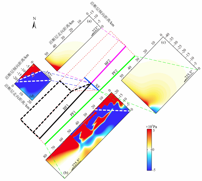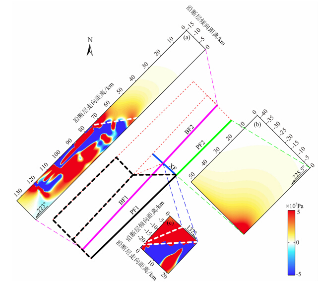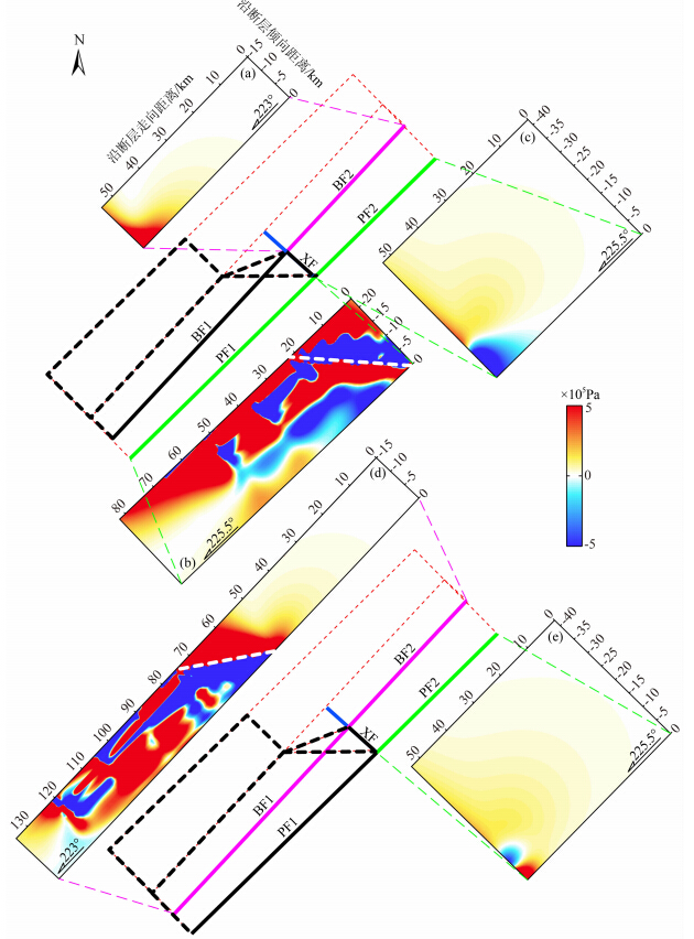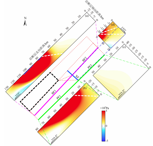 (1)如果破裂进而沿北川断层BF1段扩展(图 4),对北川断层BF2段整体上具有正应力促进作 用,在其南西端甚至达到了5×105 Pa,但对彭灌断 层PF2段南西端浅层有0~-3×105 Pa负应力抑制作用.对彭灌断层PF1段不同区域具有不同的应力作用,总体上负应力区范围偏多,在小鱼洞断层XF上具有小于-5×105 Pa的负应力抑制作用,在这种情况下不利于小鱼洞断层的破裂扩展.