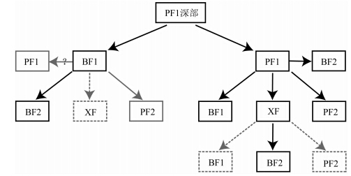 综上所述,图 7概括了不同断面破裂位移组合顺序对前方断面的应力促进或抑制的影响.汶川地震破裂在从深部向上和向北东方向扩展过程中遇到数个断层相交或分叉的路径选择.如果在第一个分叉结合部选择了北川断层BF1破裂路径后,由于对彭灌断层PF1和小鱼洞断层XF产生负应力作用,而对北川断层中段BF2的正应力作用,破裂有可能就会绕过断层PF1和XF,而直接往北川断层中段BF2上扩展.最终破裂将会比汶川地震实际发生的情况要简单的多.但是如果在第一分叉结合部首先选择了往彭灌断层PF1段的浅部扩展,对北川断层BF1,小鱼洞断层XF和彭灌断层中段PF2等均有正应力的影响,可能促进破裂的多路径扩展.所以,从静态应力的角度来说,第一个分叉点处的路径选择在破裂最终形式上有较大的影响.