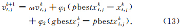 ,φ1=c1r and (),φ2=c2r and (),r and ()是取值范围(0,1)的随机数.赵玉静(2011)将速度更新公式中,从粒子当前位置指向群体最优粒子位置的位移向量用从粒子个体最优位置指向群体最优位置的位移向量来代替,则有新的粒子速度更新公式: