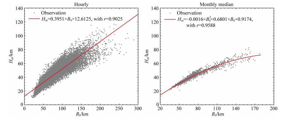 B0的观测值由频高图度量得到的电子浓度剖面通过最小二乘拟合方法来获得,拟合高度从hmF2到hmF1,如果没有F1层,则从hmF2到0.24h(电子浓度等于0.24×NmF2的高度).图 10表示标高Hm与B0观测值的散点图.左图小时值线性拟合关系为Hm=0.3951×B0+12.6125,相关系数为0.9025. 但仔细观察发现,当B0大于50 km时,Hm的变化率有减小的趋势,因此对月中值进行二次拟合,结果为Hm=-0.0016×B20+0.6801×B0+0.9174,发现有更高的相关系数0.9588.