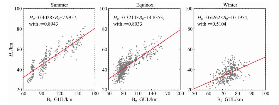 由IRI2012给出的B0_GUL和观测得到的标高Hm的关系如图 11所示,可见在不同的季节,B0_GUL和Hm之间线性相关,并且两者的相关性夏季大于春秋季大于冬季,相关系数分别为0.8943,0.8033和0.5104,冬季的相关性较弱,这反映了IRI2012冬季B0的结果还有很大的提升空间.经计算,B0_ABT和Hm的相关系数为夏季0.8307、春秋季0.7603和冬季0.3252;B0_TAB和Hm的相关系数为夏季0.7367、春秋季0.6677和冬季0.3720,可见B0_GUL和Hm之间的相关性最好.由于构建Gulyaeva模式的数据主要来自中纬地区的台站(Gulyaeva,1987),因此北京地区的标高Hm与B0_GUL的相关性最强不难理解.