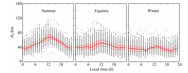 ![]() | 图 2 夏季、春秋季和冬季标高Hm的周日变化 灰色散点表示每小时的观测值,实线表示小时值的季节平均,误差棒表示标准差. Fig. 2 Diurnal variation of Hm for summer,equinox and winter seasons Gray dots represent hourly values. The solid lines with vertical bars are the seasonal averages with the st and ard deviations. |