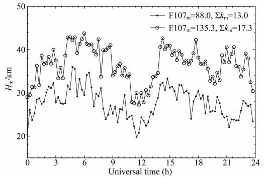太阳F107指数表示太阳10.7 cm(2800 MHz)射电流量,是表征太阳活动的一个重要指数.k指数 是当地磁场扰动的表征参数,本文以北京站的k指数表示地磁场扰动情况.选取了标高Hm在低等太 阳活动和中等太阳活动条件下各3天的数据,用3天的均值来考察太阳活动对标高周日变化的影响.2010年12月10日至12日太阳活动指数F107的均值F107m=88.0,地磁指数Σk(一天8个k指数的和)的均值为Σkm=13.0.2011年12月10日至12日F107m=135.3,Σkm=17.3.可见在这两个时间段内地磁场较平静,而前者为低等太阳活动水平,后者为中等太阳活动水平,对应的标高Hm的周日变化如图 3所示.由图 3可知,在低等和中等太阳活动水平下,标高有相似的周日变化规律,日出后增大,下午减小,20 ∶ 00LT以后又较快地增大,其后逐渐减小;太阳活动对标高的大小有显著的影响,标高随太阳活动的增强而增加,中等太阳活动较低等太阳活动标高增加了10 km左右.