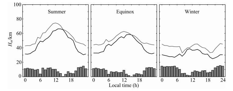 ![]() | 图 4 在F107>120(灰色实线)和F107<100(黑色实线)条件下,北京地区 标高Hm在夏季、春秋季和冬季的周日变化,灰条表示两者的差异 Fig. 4 Diurnal variations of Hm for F107>120(gray lines) and F107<100(black lines)for summer,equinox and winter at Beijing. The gray bars are the differences between the two |