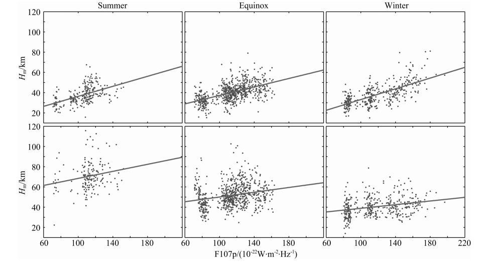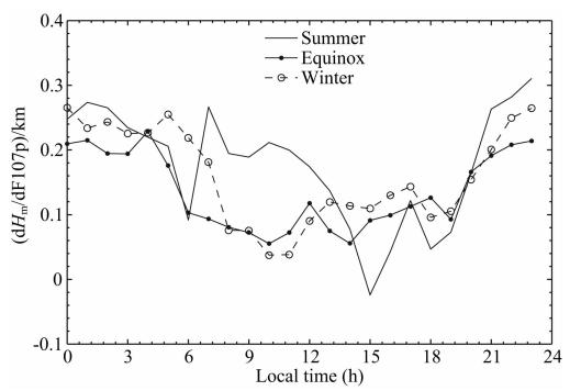Richards等(1994)和Liu等(2006a)指出在高层大气物理研究中,用F107p指数可以准确地表示太阳活动的周期变化.F107p=(F107+F107A)/2,其中F107A是F107指数81天的滑动平均.本文研究的时间范围内,F107p有最大值196.8,最小值71.0,平均值112.8,基本覆盖了由低到高的太阳活动水平.为了研究标高Hm随太阳活动的变化,分析标高Hm与F107p的关系.图 5表示不同季节标高Hm与F107p关系的散点图.图 5表明,标高Hm随太阳活动指数F107p线性增加,午夜的增加率(dHm/dF107p)大于正午,冬季最为明显.图 6表示dHm/dF107p在夏季、春秋季和冬季的周日变化.可见,对于春秋季和冬季,标高Hm随F107p的增加率夜晚大于白天,白天为0.1左右,夜晚约是白天的2倍;夏季较复杂,白天07 ∶ 00—14 ∶ 00LT明显大于其他季节,而在15 ∶ 00LT小于其他季节,夜晚的变化趋势与其他季节一致,只是变化率稍大一些.