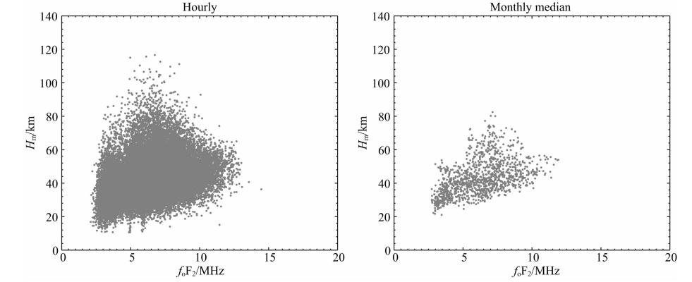 ![]() | 图 9 北京地区标高Hm和F2层峰值高度hmF2的散点图 左图表示小时值,右图表示月中值 Fig. 9 Scatter plots of Hm versus hmF2 for Beijing Left panel shows daily hourly data, and right panel shows monthly median data |