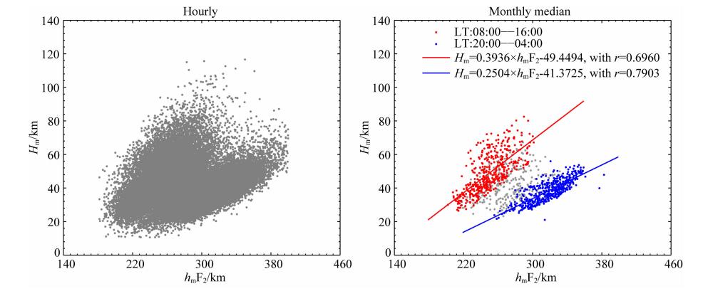 标高Hm与hmF2的散点图如图 9所示.由图 9 左图可知,Hm与hmF2几乎没有相关性(r=0.18),没有预想的中等强度的相关,有趣的是散点出现了 两个分支.将数据分为两组(08 ∶ 00—16 ∶ 00LT一组,20 ∶ 00—04 ∶ 00LT一组)后,恰好对应散点图的两个分支,如图 9右图所示,可见两组数据的Hm与hmF2都有中等强度的相关,并且晚间的相关性强于白天,达到了0.79.