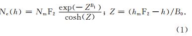 通过研究发现,标高Hm与IRI的底部厚度参数B0有很强的相关性.可以利用IRI提供的参数推算出标高Hm,进而外推电离层hmF2以上的电子浓度剖面(Bilitza,2001).在IRI中用NmF2,hmF2,B0和B1来描述电离层的电子浓度剖面(Bilitza et al., 2014),公式如下: