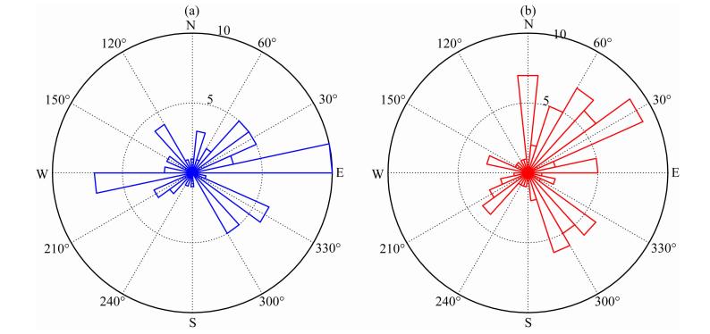 图 8是所有重力波事件(151)的传播方向分布图.海南富克(8a)和广西桂平(8b)对应的重力波事件个数分别是65和86.此图表明观测的中国低纬地区的重力波整体趋向于向东传播.由于冬季的重力波观测事件数较少,为了得到该地区更加准确的重力波传播方向分布,足够多的在冬季的成像观测是有必要的.