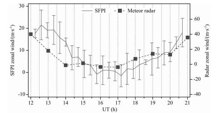 ![]() | 图 4 2014年3月24日SFPI与Meteor radar观测的低热层纬向风速对比 Fig. 4 Zonal winds in lower thermosphere from SFPI vs. Meteor radar at March 24,2014 |
