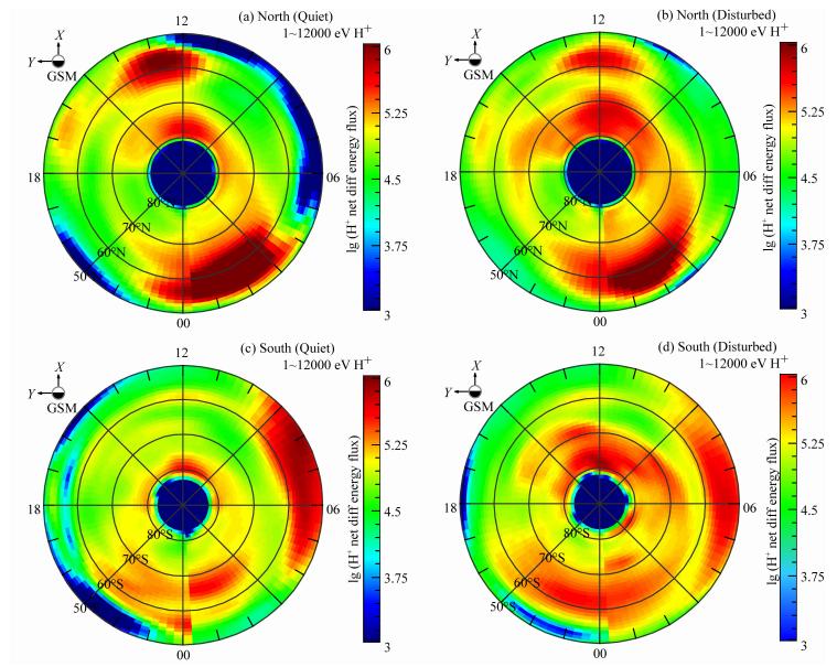 图 4显示了上行H+净积分能通量的分布情况.日侧极尖区、北半球的日侧椭圆带、午夜椭圆带和南半球的黎明椭圆带是积分通量较大的区域.我们有理由相信这些区域是电离层上行的主要源区.此外,第一,磁扰期南半球的积分通量增加比北半球的明显;第二,磁扰期间高磁纬度的积分通量增加明显.