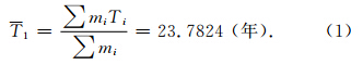 每颗行星绕太阳系质心运动的恒星周期是已知的(如表 1第2列).根据太阳系星云盘演化理论,最初的星云盘是连在一起整体运动的,当太阳本体独立出来以后,整个行星系统星云盘就应该具有绕太阳运动的平均恒星周期.因此8大行星对行星系统质心的恒星周期的贡献一定和各自行星的质量正相 关,所以根据各行星的质量权重(考虑到卫星的贡 献)可以求得行星系统质心绕太阳系质心运动的加权平均恒星周期: