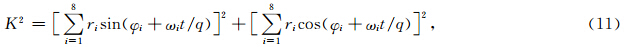 刘复刚和王建(2013c)对K指数图像的横坐标时间单位进行改正,其改正系数m=1.0987.这样的作法在整个时间尺度不断放大的同时,对应的误差也可能会放大.因为太阳和行星系质心同步绕太阳系质心运动,为体现太阳轨道运动的恒星周期,可以应用修正系数q=1.11518来调控8大行星绕太阳系质心运动的平均角速度,以确保太阳轨道运动的平均恒星周期是22.1826年.这时K指数方程的角速度调整为ωi/q,