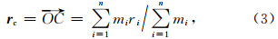 理论力学中,假定有n个质点,它们的质量分别是m1,m2,…,mn,位于P1,P2,…,Pn诸点,这些点对某一指定的参照点O的位矢分别是 r 1,r 2,…,r n,则质心C(或叫质点组的质量中心)对定点O的位矢 r c满足(3)式关系(周衍柏,1986):