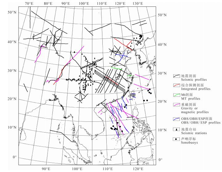中国大陆及海域位于欧亚、印度与太平洋三大板块的交汇部位,是地球动力学研究的重点地区,因此,中国海陆莫霍面深度分布特征的研究一直也是科研人员关注的热点.近年来,有不少学者依据对中国地壳厚度的研究结果编制了各种的图件(刘光鼎, 1992,1993;曾融生等,1995;朱介寿,1996;Li and Mooney, 1998;方剑,1999;滕吉文等,2002;高星等,2005;Li et al., 2006;黄建平等,2006),其中最有代表性的为刘光鼎等(1992,1993)第一次将我国海、陆结合在一起编绘的地球物理系列图中,将海、陆置于统一构造演化体系中进行研究时所编绘的1 ∶ 1000万的莫霍面深度分布图.但美中不足的是该图虽对海陆结合带给予了足够的重视,却未能完全覆盖整个中国大陆地区.此外,近年来很多根据人工地震深部探测结果结合重力资料的反演结果也有发表,如朱介寿等(1996)编制的1 ∶ 1200万莫霍面深度分布图,以中国大陆地区的人工地震测深剖面为基础,在全国范围内取得400多个莫霍面深度值.曾融生等(1995)利用20世纪90年代以前的地震测深结果,编制中国大陆莫霍面深度图,西部地区采用了面波和其他地球物理资料.为了容易与大地构造相比较还采用了分区的办法.Li和Mooney(1998)以及Li等(2006)总结了自1958年以来的由中国地震局地球物理勘探中心等单位完成的深地震探测剖面(DDS)约90条,根据地震测深数据绘制了中国大陆地区地壳结构示意图.滕吉文等(2002)对东亚地区莫霍面深度分布开展了研究并编绘了1 ∶ 2500万的地壳厚度图,高星等(2005)则利用中国及邻近地区数字地震台网提供的三分量地震波形记录,应用转换函数及快速模拟退火算法对中国及邻区61个地震台站下的地壳横波速度结构进行了反演.结合已发表的人工地震测深资料获得了该地区地壳厚度分布.这些工作为我国地壳深部结构的研究打下了坚实的基础.但由于这些研究大多局限在中国大陆内部或向海域延伸有限,对于探索中国大陆宏观构造格架的延伸以及海陆相互作用关系等问题而言,仍存在一定的局限.因此,有必要在对我国50年来在中国海域与陆区的地球物理调查成果,特别是近年来一系列专项调查获得的最新资料进行充分研究的基础上,编制中国海陆1 ∶ 500万莫霍面深度图.并聚焦欧亚板块、太平洋板块以及印度洋板块之间的相互作用及其在中国大陆与海区所引发的构造效应,以中国大陆板块边缘和板块内部的构造演化及其宏观格架为重点,为中国大陆边缘和中国海动力学等方面的研究提供基础图件.
