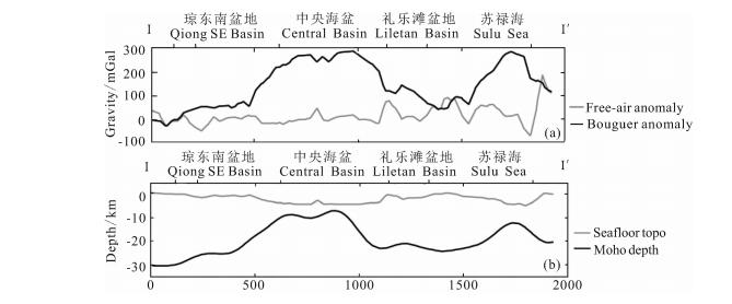 从大陆地区向海区,莫霍面深度也反映了地壳性质的转变.但同为洋壳的情况下,图 8中南海中央海盆处的莫霍面起伏形态及埋深情况与苏禄海的情况仍有所不同,推其原因应是拉张机制与拉张速率存在着差异的反映.