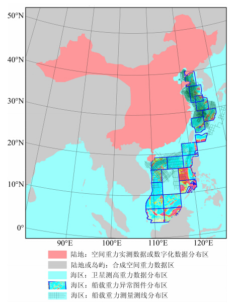 调查的空间重力异常数据,中国台湾及印度大陆有出版的空间重力异常图数字化数据.卫星测高计算重力数据覆盖全部海区,部分海区还有船载测量得到的空间重力异常数据,以及部分船载重力测量网格化的成果数据.图 1和图 2分别展示了图幅范围内多种来源的重力数据的分布范围和数据类型的关系.