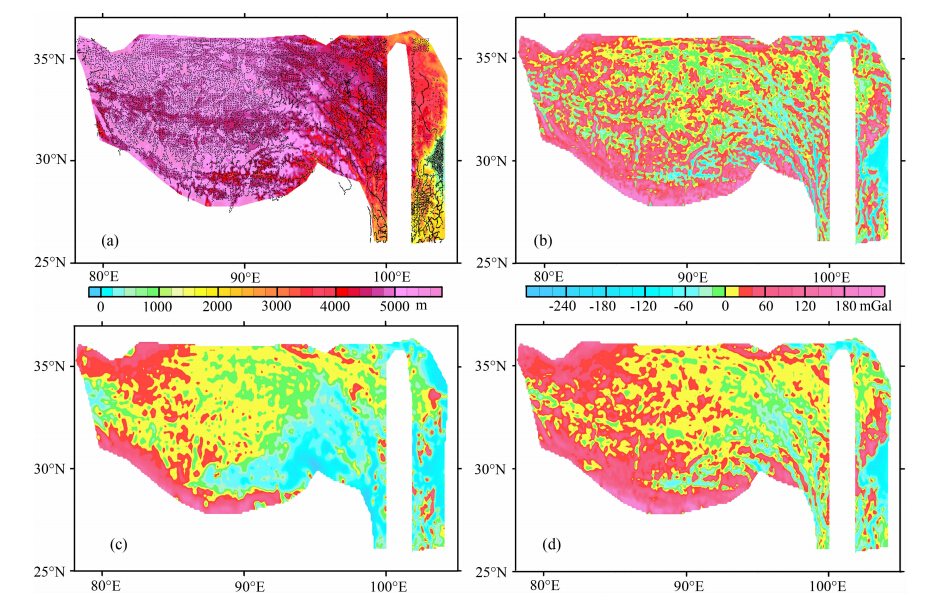 图 3(a)青藏高原地区地面实测重力点位图(底图为地形,黑点表示点位),(b)EGM2008地球 重力场模型数据,(c)实测空间重力网格数据,(d)合成空间重力数据 Fig. 3(a)Ground measured gravity points in the Tibetan Plateau(base map is topography,black points reprecent the location), (b)EGM2008 data,(c)Ground measured gravity grid data,(d)Synthetic free-air gravity data |