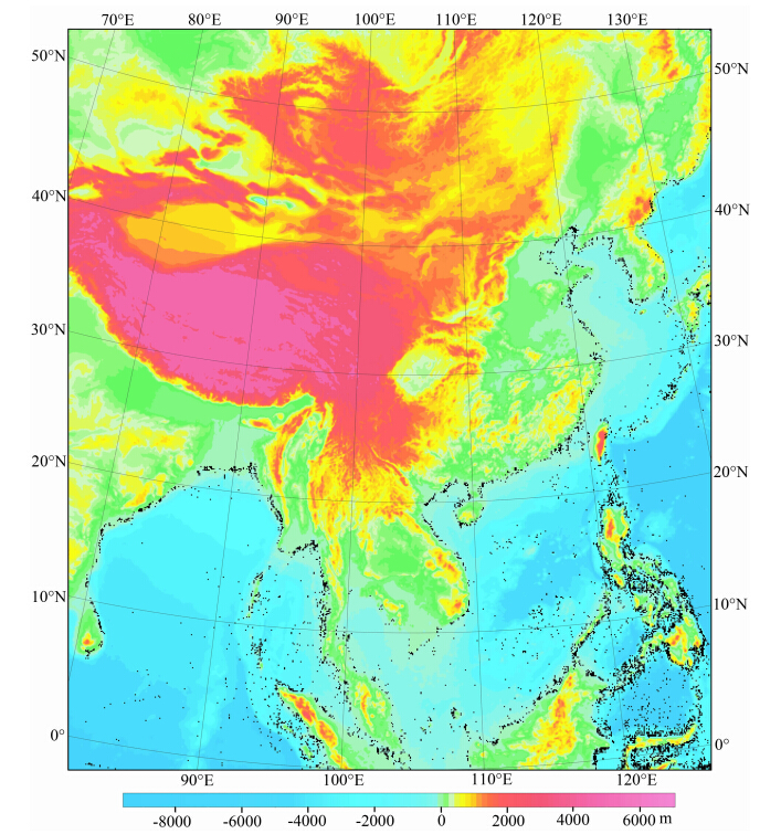 地球空间重力异常指地球自然表面上的实测重力值,经过高度改正后,再减去正常重力场值得到的重力差.空间重力异常是由地壳以及上地幔物质密度不均匀分布而产生,反映的是实际地球的形状和质量分布与理论参考椭球体的差异.空间重力异常场作为地球的一种基本位场信息,是大地测量、地球物理、地质、地震与海洋等学科重要的研究对象和手段.2008年中国地质调查局启动了编制1 ∶ 500万中国海陆及邻区地质、地球物理系列图的项目.空间重力异常图是系列图件中的一个基础图件.这是继刘光鼎于1993年出版的中国海及邻域地质地球物理系列图集之后(刘光鼎,1993),对我国20多年来地 质、地球物理调查和研究成果的汇总和展示.相比20年前的“系列图”,此次的编图范围更大,它包括 了整个中国大陆和中国海以及周边陆区和海域(图 1).