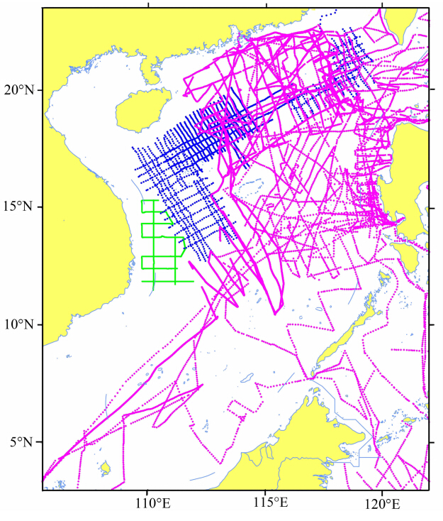 图 5 中国南海海区海测重力数据点位分布图 A(绿色线):西沙西南海域1993年实测重力数据;B(蓝色线):二海1983—1985年实测; C(紫色线):拉蒙特—多尔蒂研究所 1980实测,来自美国NGDC网站. Fig. 5 Shipboard gravity survey track lines in the South China Sea A(green lines):Gravity survey in the southwest Xisha area in 1993; B(blue lines):Gravity survey by the second marine survey in 1983—1985;C(purple lines): Gravity survey by Lamont- Doherty geological Observatory in 1980,data is from NGDC website. |