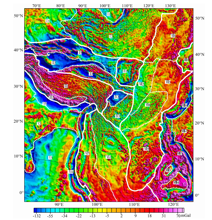 图幅西部由喜马拉雅重力梯级带和昆仑山—祁连山—秦岭—大别重力梯级带所围限的青藏高原异常区以及若开—苏门答腊—爪哇梯级带和中南半岛东部梯级带围限的马来半岛—中南半岛异常区的特征反映出印澳板块向欧亚板块俯冲,物质向东蠕散,被刚硬的古老块体阻挡后向南挤出的特点,共同构成了受印澳板块活动影响的构造域.该构造域以东,鄂尔多斯—四川—云贵异常区,以及中南半岛东部的重力梯级带可看作异常过渡区带,最东部为极为 醒目的琉球—台湾—马尼拉—菲律宾—苏禄海—苏拉威西海沟-弧-盆正负异常条带伴生的梯级带,与菲律宾海,日本海,苏禄海及苏拉威西海海盆组成沟、弧、盆异常区;其西部的中国东部异常区异常呈明显的NE走向,反映出该区构造主要受太平洋板块向西俯冲运动的影响,这两个异常区构成了太平洋构造域;而印澳构造域和太平洋构造域之间的鄂尔多斯和四川、云贵异常区则为过渡域,马来—中南半岛异常区也通过中南半岛东部的走滑断裂向中国东部异常区过渡;图幅北部西伯利亚,哈萨克斯坦等地区,新疆—青海盆山相间异常区由于距离现代板块运动力场比较远,所受影响较中国东、西部小,更多地反映一种古体制下构造运动产生的构造遗迹.