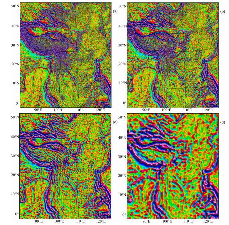 图 7 中国海陆及邻区小波分析1~4阶细节图 (a)小波变化一阶细节;(b)小波变化二阶细节;(c)小波变化三阶细节;(d)小波变化四阶细节. Fig. 7 First to fourth degree wavelet transform details of free-air gravity anomalies in the l and and seas of China and adjacent areas (a)The first order;(b)The second order;(c)The third order;(d)The forth order. |