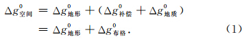 NGA在构建EGM2008重力模型时用EGM96以及GRACE卫星重力场模型的低阶球谐系数计算 得到长波重力异常,用高精度剩余地形数据(RTM)计算出地形的重力效应得到短波重力异常,二者相加合成平均空间重力数据.虽然这种方法避免了以往依赖于某种任何均衡假说用地形重力效应加均衡重力效应的合成方法的缺陷,也极大提高重力数据与实际数据的符合度,但在地形复杂的地区,总效应与地面实测重力还有较大的差距.因为该方法只能提高重力场的短波信号的模拟,而空间重力异常的场源实际上是由地形质量、地质质量和补偿质量三部分组成,其计算的长波长重力异常并不能等同于补偿质量,尤其不能代替地质质量产生的重力效应.针对这个缺陷,我们依据掌握的数据,提出了一种利用布格重力异常反推平均空间重力异常的合成方法.布格重力异常是空间重力异常进行了地形和中间层改正后的重力异常,与局部地形相关性很小,因此它包含地质质量和补偿质量两部分的重力效应,如式(1)所示: