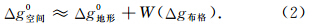 在地形复杂的地区直接使用实测空间重力异常计算网格节点上的平均空间重力异常值是不合适的.因为这意味着我们把测点布格异常Δg布格和地形质量的重力效应Δg地形也进行了网格化—— W(Δg布格)和W(Δg地形),Δg地形取决于测点周围(主要是0~20 km范围内)的地形环境,由于地形千差万别,致使Δg地形变化幅度很大,网格化误差难以把握.我们可以利用与地形相关性小的网格化布格异常值W(Δg布格),用公式(2)求取节点空间异常值,这就避开了测点周围地形影响的困扰.公式(2)为