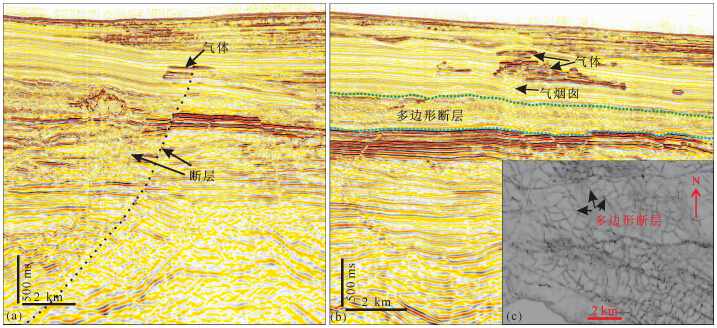 由于多边形断层发育层位的特殊性(细粒沉积物),其作为流体运移的通道需要一定的条件.多边形断层的形成过程也是其开启的过程,在这个过程中会伴随有大量的流体排出(Sun et al., 2010).这种高压流体的释放可能与多边形断层的形成机制有 关,如矿物脱水成岩等(吴时国等,2009;Cartwright,2011). 多边形断层形成以后就会闭合,并且多边形断层层(细粒沉积物)将会是比较好的盖层.但是,一旦压力再次聚集到一定程度,多边形断层就会活化,重新成为流体运移的通道(Sun et al., 2009).与多边形断层形成时较大范围的超压不同,这种压力的再次聚集和多边形断层的活化一般只会发育在很小的范围内,并且往往与下部构造有关(图 2b).这种多边形断层的活化一方面意味着原有多边形断层的开启,另一方面也可能经由水力压裂形成许多小裂隙.流体继续运移就会在多边形断层之上形成气烟囱和强振幅反射(图 2b).