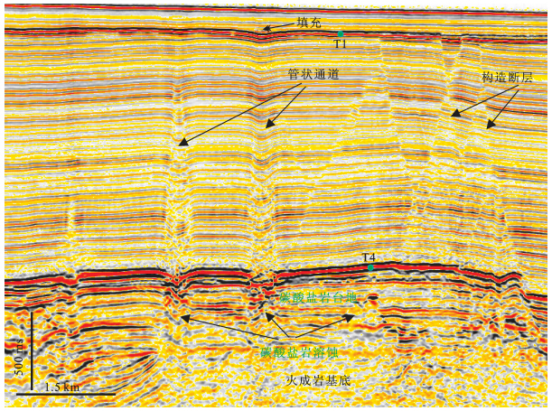 碳酸盐岩溶蚀管状通道是管状流体活动系统的一种重要的类型,它在我国南海北部东沙隆起(Sun et al., 2013b)和西部的广乐隆起之上(Sun et al., 2013a)非常发育.它发育在碳酸盐岩台地之上,主要是由碳酸盐岩在热液流体的溶蚀作用下发生碳酸盐岩溶蚀垮塌所形成的(Sun et al., 2013b).东沙之上的碳酸盐岩溶蚀通道一般终止于晚中新世和上新世界面处(T1)或稍微到界面之上;构造断层也多终止于该界面处(图 4).这一时期是新构造东沙运动的主要活动期(Lüdmann and Wong, 1999;赵淑娟等,2012),研究发现碳酸盐岩溶蚀管状通道与东沙运动密切相关(Sun et al., 2013b).东沙运动造成的岩浆侵入带来大量的腐蚀性的热液流体,这些热液流体导致了碳酸盐岩的溶蚀垮塌而形成“管状”的流体运移通道.溶蚀所形成的管状通道一般下部地震反射较为杂乱(受地层垮塌和流体活动的影响),上部表现为规则的下拉地震反射特征.部分管状通道之上发育两端上超的填充构造,说明其发育到古海底并形成麻坑,然后接受沉积物填充所形成的.