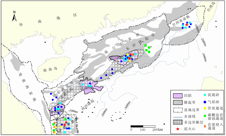 流体活动系统(Focused fluid flow system)在深水油气和天然气水合物成藏、深水地质灾害和全球环境变化等方面的研究中备受关注,从而成为海洋地质科学研究的前沿热点.流体活动系统通常指地震上有明显识别特征的沿着局限的高渗带发生运移/流动的束状流体.它一般发育在封盖性能良好的地层中(低孔隙度低渗透率),在局限的范围内提供流体垂向或亚垂向快速运移的通道.它主要包括泥火山、泥底辟、气烟囱、构造断层、多边形断层、碳酸 盐岩/蒸发岩溶蚀管状通道和砂岩侵入体等多种类型.