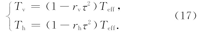 进行海面风速反演,可考虑单层大气模型,假设 Ω=1,TC=0, 将大气温度用等效温度Teff表示,认为 Ts=Teff, 则星载全极化微波辐射计垂直通道和 水平通道观测亮温可以由方程(1)和(4)推导简化为: