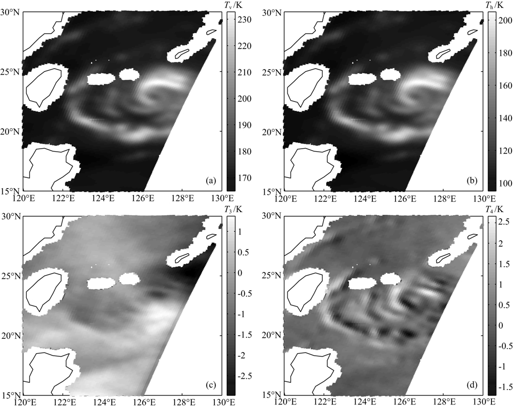 在图 1所示的WindSat 10.7 GHz各极化通道亮温图像中去掉了陆地、海岸和近海岸数据,仅保留下垫面标识为海洋的亮温图像,这是由于近海岸水体和远离海岸的水体的运动学特征存在差异.受海岸轮廓及海底大陆架对水体运动的影响,在近海岸处无法利用全极化微波辐射计进行海面风场反演.由图 1可以看出,WindSat水平极化通道亮温 Th 的分布特征与垂直极化通道亮温 Tv 类似,数值略小.从 Tv 和 Th 的分布图像可以清晰地看到:在台风风速逐渐增大的外围区,WindSat观测亮温随着海面风速的不连续变化而变化;在围绕台风眼的中圈,由于高风速引起的海面粗糙度很高,WindSat观测亮温值也很高;在台风眼区域,WindSat观测亮温随海面风速的减小而迅速减小,台风眼的位置在亮温图像上明确地被显示出来.由10.7 GHz交叉极化通道(第三和第四Stokes极化通道)亮温图像可以看出,随相对风向角的变化, T3和T4 的符号及大小存在周期性变化.由此可见,各极化通道的亮温特征包含了海面风速和海面风向信息,可通过选择观测通道,构建反演算法,将台风区域海面风场反演出来.