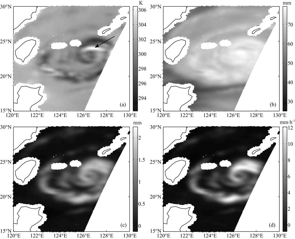 从反演结果可以看出,台风区域海面温度因降水的作用在整体上低于周围海域,但在台风中圈存在一个明显的暖涡结构(图 6a箭头所示),并且台风周围大范围水汽含量很高(图 6b),在底层风场的作用下水汽不断地被输送到台风内部,此刻台风正处于旺盛发展阶段,强度将会进一步加强.