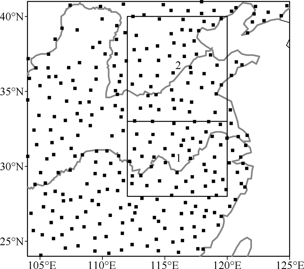 图 1 我国285个气象台站的位置分布(黑色实心矩形) 图中南北2个矩形标示南方和北方地区. 图中灰线标示出长江和黄河干流位置. Fig.1 The locations of 285 rain gauge stations over mainland China (black solid rectangles) Two key regions are marked by rectangles: they are the South and North region. The locations of the Yellowand Yangtze River are marked by gray lines. |