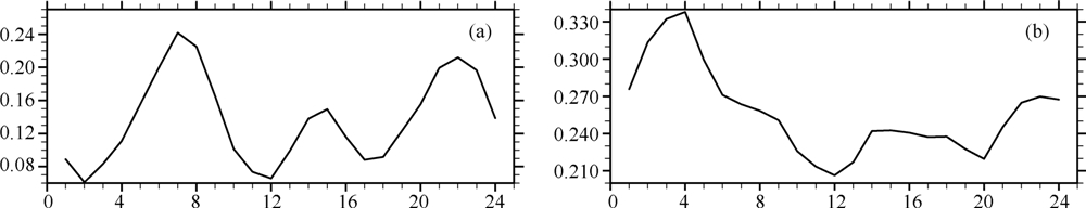 图 3 标准化后夏季平均的(a)南方和(b)北方地区不同持续时间降水事件的降水量的日变化 横坐标为北京时,纵坐标为降水持续时间(单位:h) Fig.3 Diurnal variation of normalized summer rainfall amount with different duration time (by the daily mean) averaged in (a) the South and (b) North Region The X-axis denotes the Beijing Time. The Y-axis denotes the duration time (unit: h) |